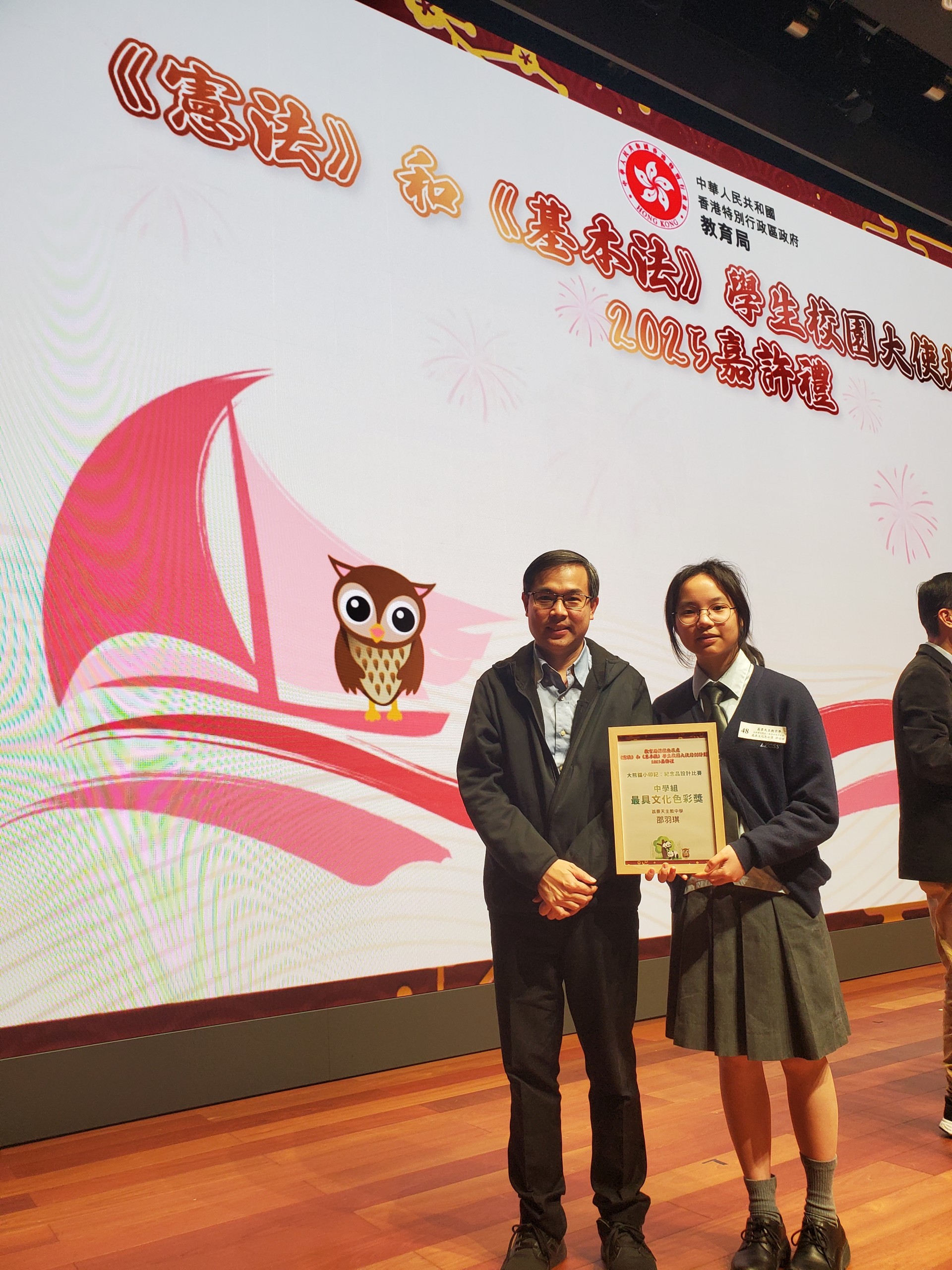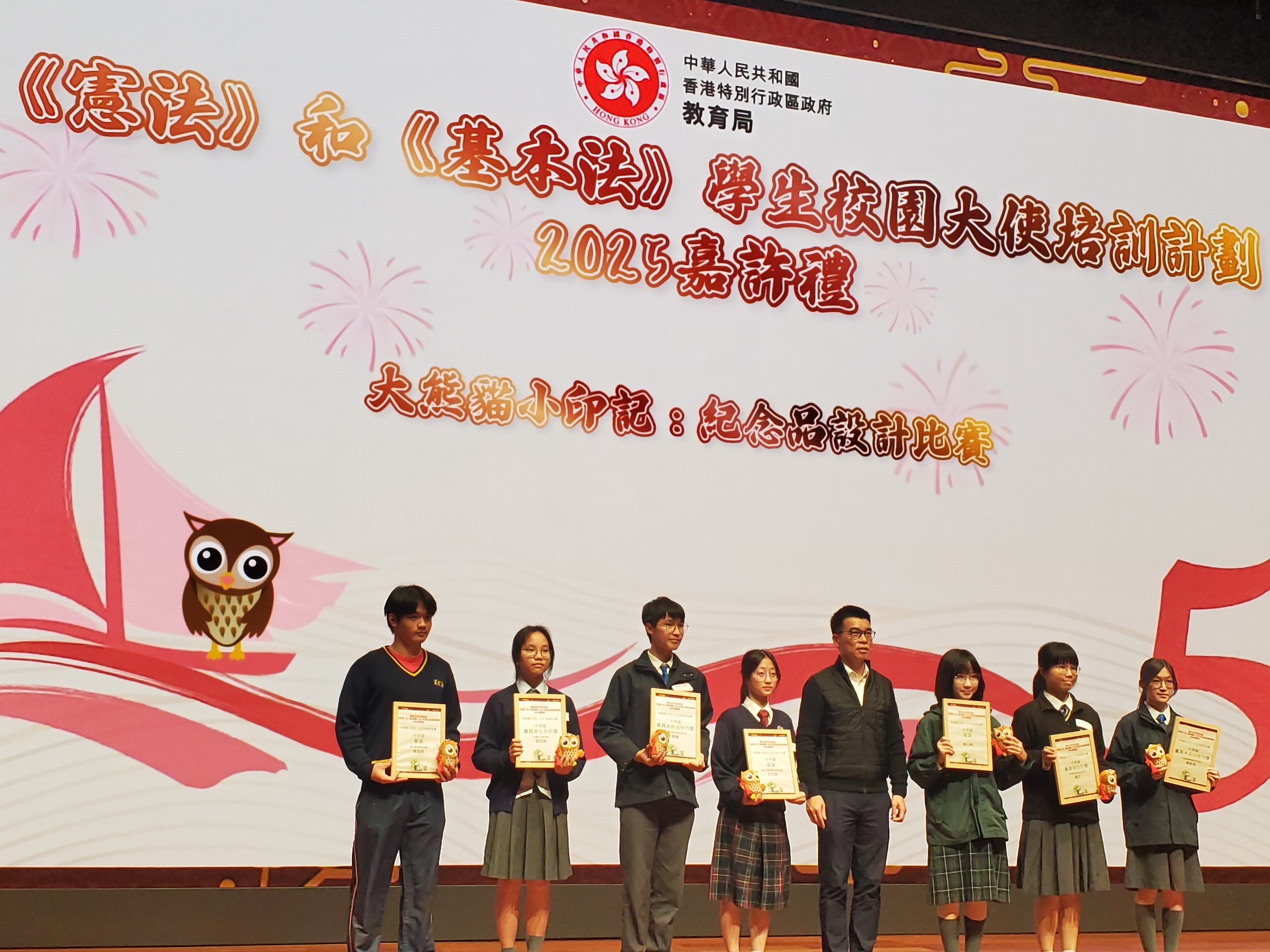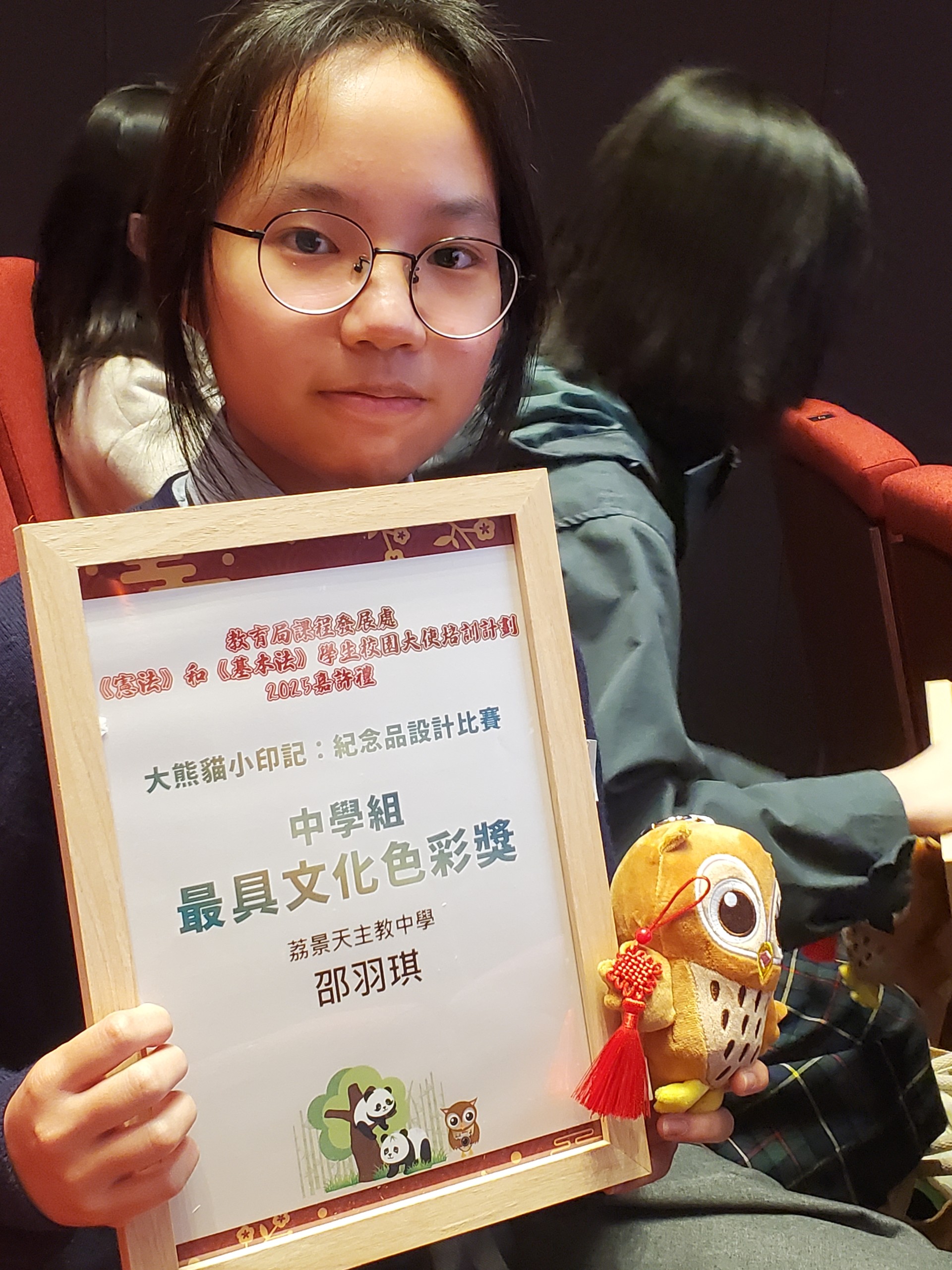 學生邵羽琪於2024/25學年獲提名參加由教育局課程發展處舉辦的《憲法》和《基本法》學生校園大使培訓計劃 (大使計劃),協助學校組織校本國民教育學習活動。教育局秘書處及評審委員會就「大熊貓小印記:紀念品設計比賽」、積極籌辦校本活動及學生大使獎項已遴選出得獎學校和大使,誠邀大使計劃統籌教師及表現出色的大使出席2025嘉許禮。