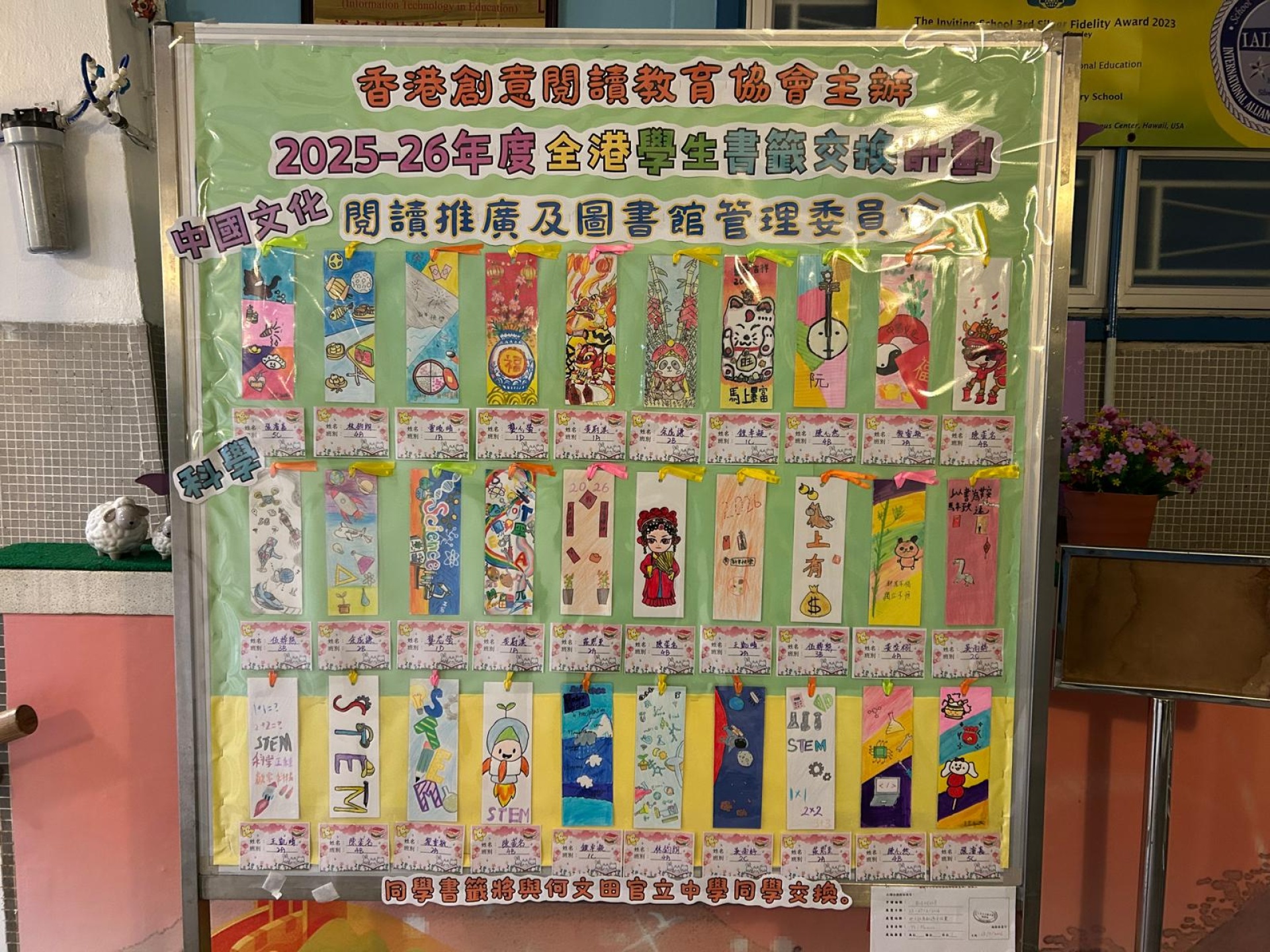 閱讀及圖書館管理委員會為提升學生的閱讀興趣及培養學生的閱讀習慣,鼓勵學生參加由「香港創意閲讀教育協會」舉辦的「全港學生書籤交換計劃」。 學生們積極參與,用心繪畫書籤,實在值得表揚。